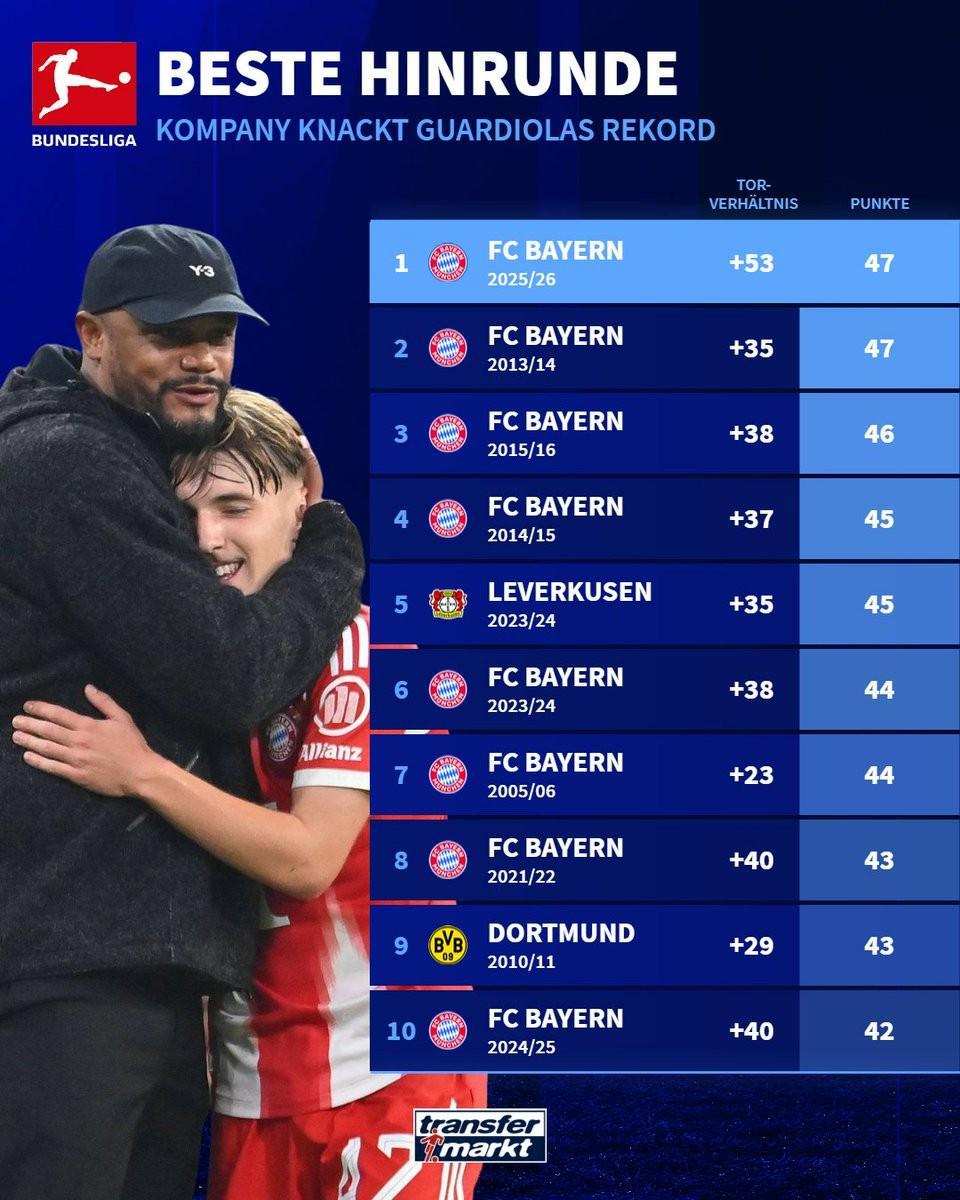 德甲历史上半程最佳战绩前十:拜仁独占八席,多特药厂各一席