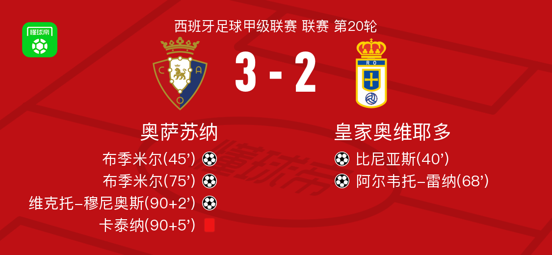 奥萨苏纳3-2逆转皇家奥维耶多,布季米尔梅开二度,维克托-穆尼奥斯破门