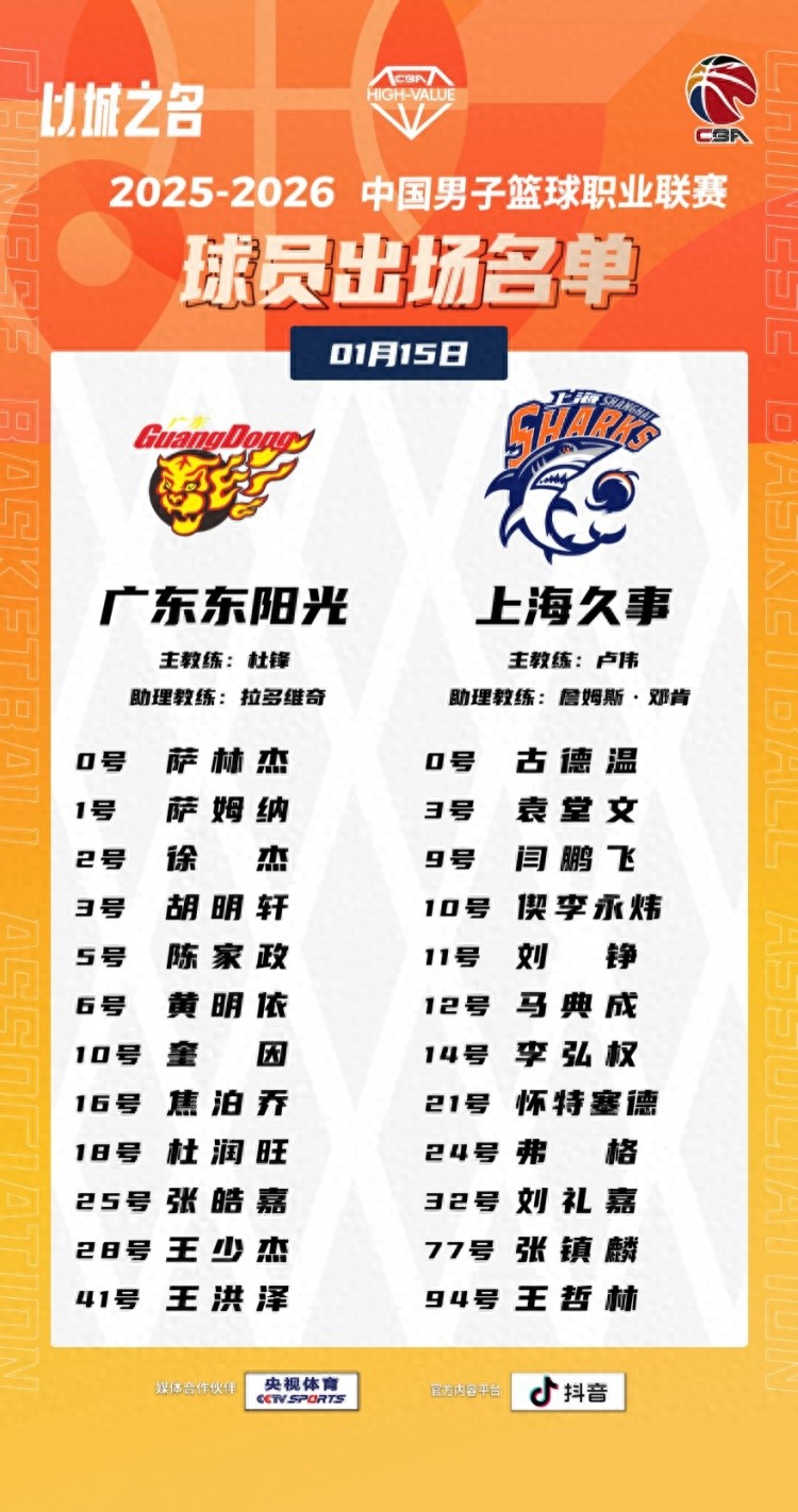 CBA全明星投票首周票数公布:徐杰、赵睿分别当选南北区票王