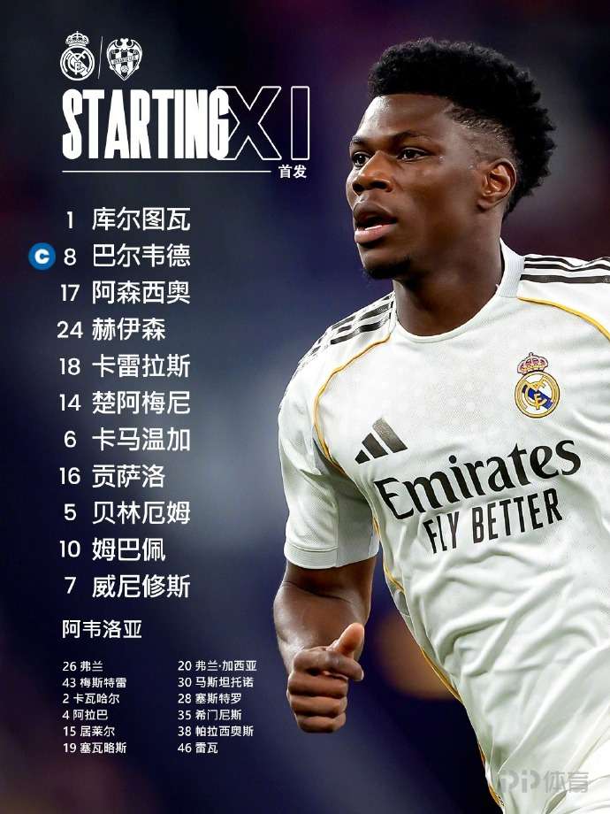 皇马首发:1-库尔图瓦、17-劳尔·阿森西奥、18-卡雷拉斯、24-赫伊森、8-巴尔韦德、5-贝林厄姆、6-卡马文加、14-琼阿梅尼、7-维尼修斯、10-姆巴佩、16-贡萨洛·加西亚