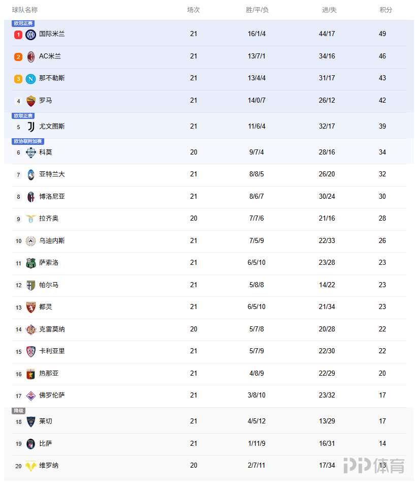 本轮意甲,米兰1-0莱切,罗马2-0都灵,最新形势如下: