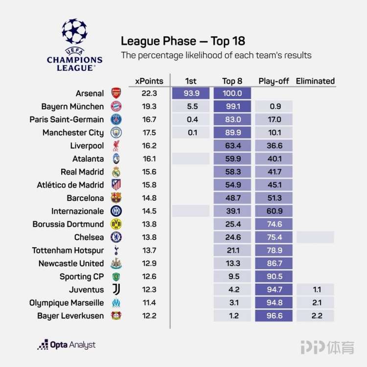 opta预测了本赛季欧冠联赛阶段的预期积分,以及直接晋级前八和参加附加赛的概率。阿森纳将93.9%获得联赛阶段头名,拜仁仅5.5%概率获得头名。