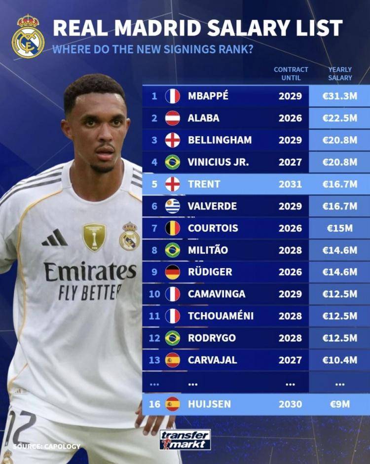 皇家马德里的年薪排名:Mbappe排名第一 阿诺德排名第五 罗德里戈排名第12